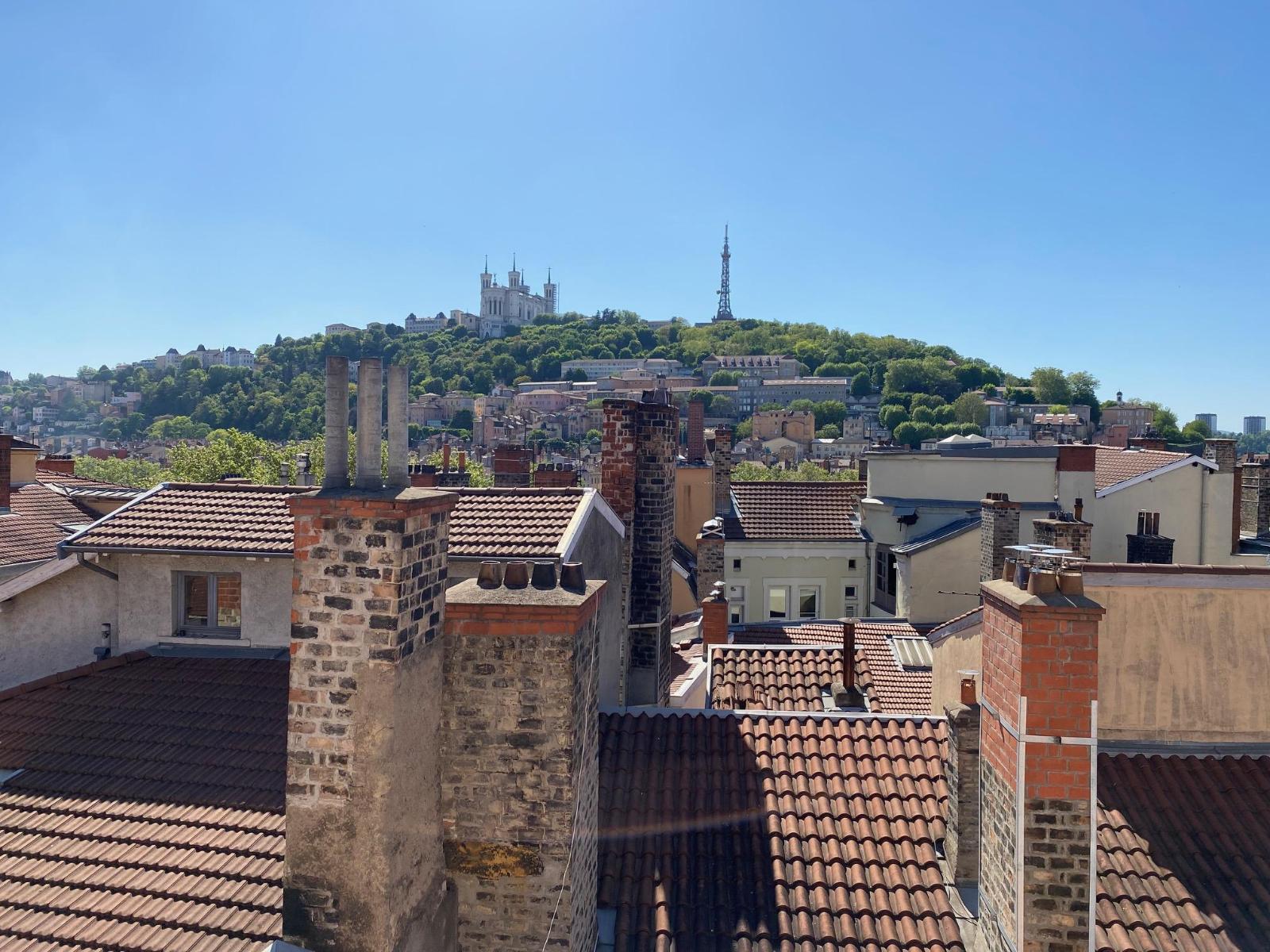 Superbe T2 de 49.02m² atypique en duplex au 6ème et dernier étage sans ascenseur avec une vue panoramique sur Fourvière – composé d’un séjour et coin cuisine aménagée et équipée (plaques de cuisson 2 feux, un réfrigérateur, un four micro-onde, un lave vaisselle), une buanderie, une chambre, une grande salle de bain avec un lave linge et WC.