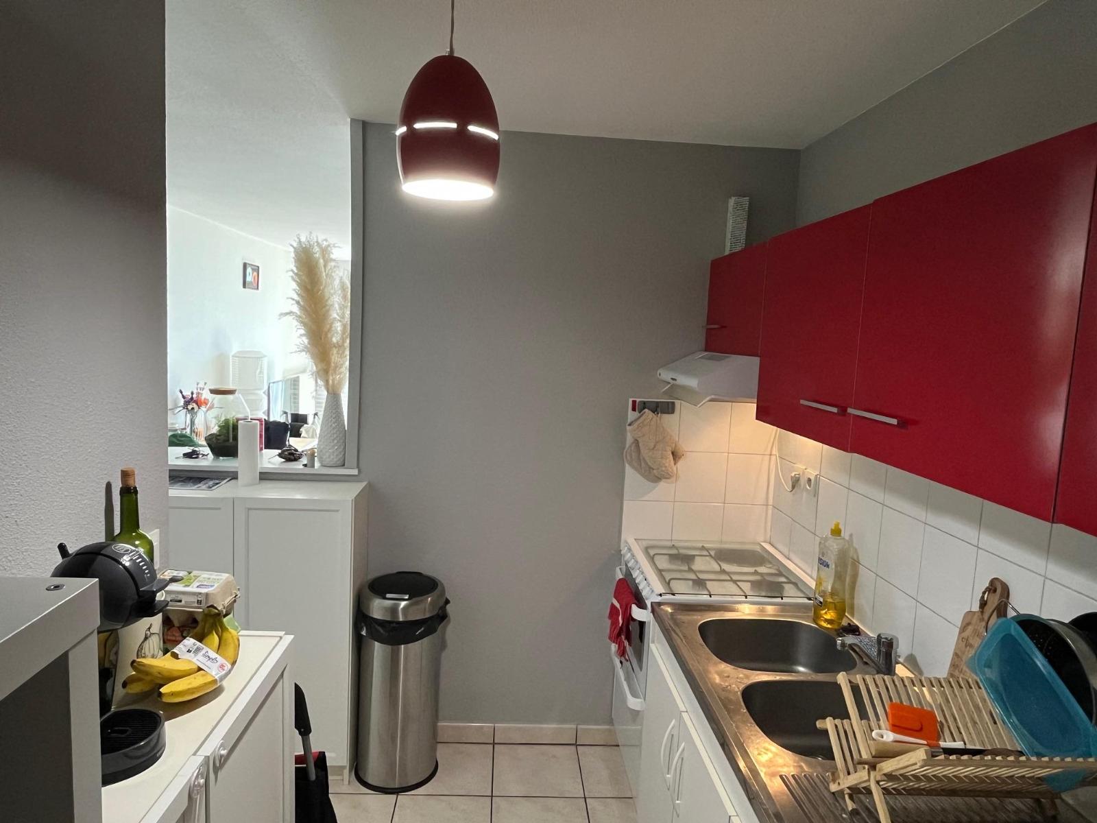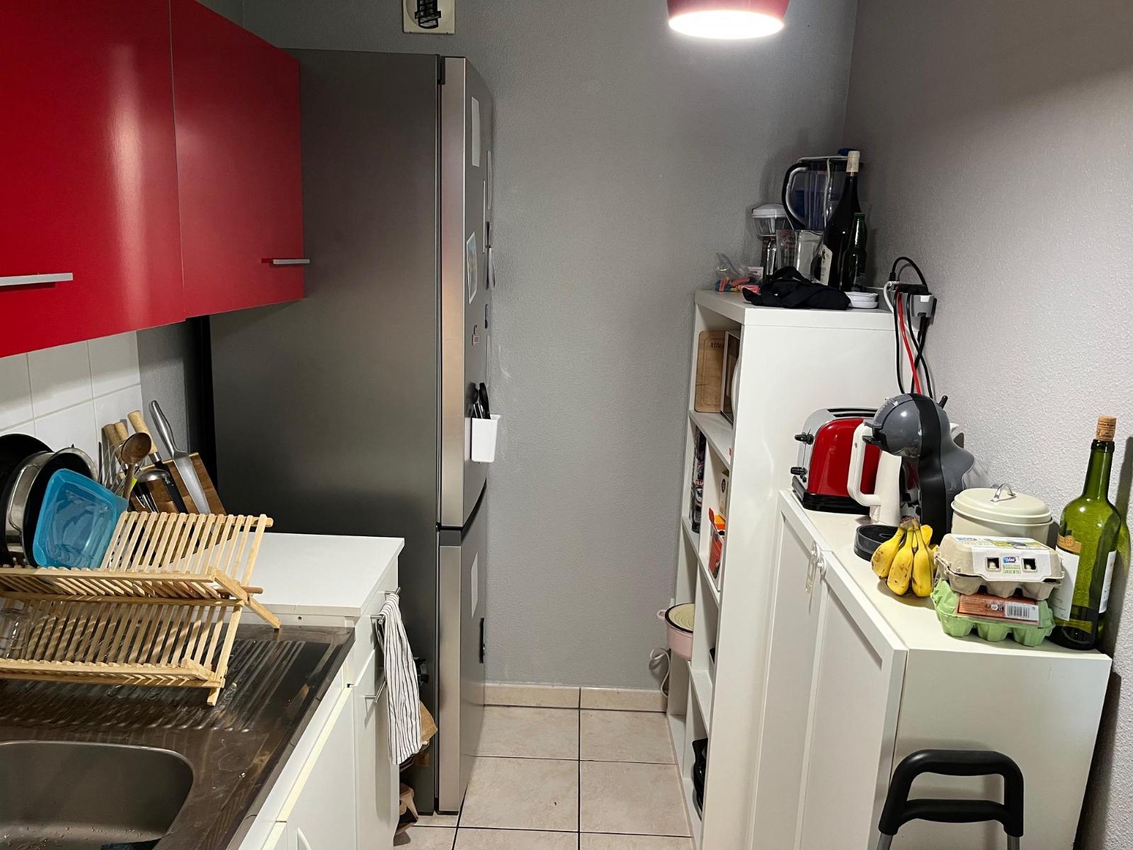 -Une cuisine ouverte sur le séjour, dégagement avec deux rangements muraux