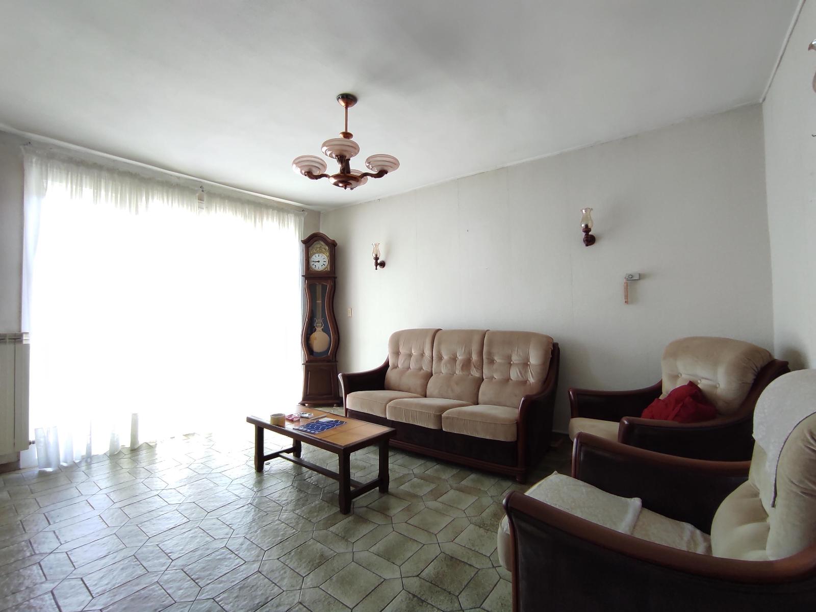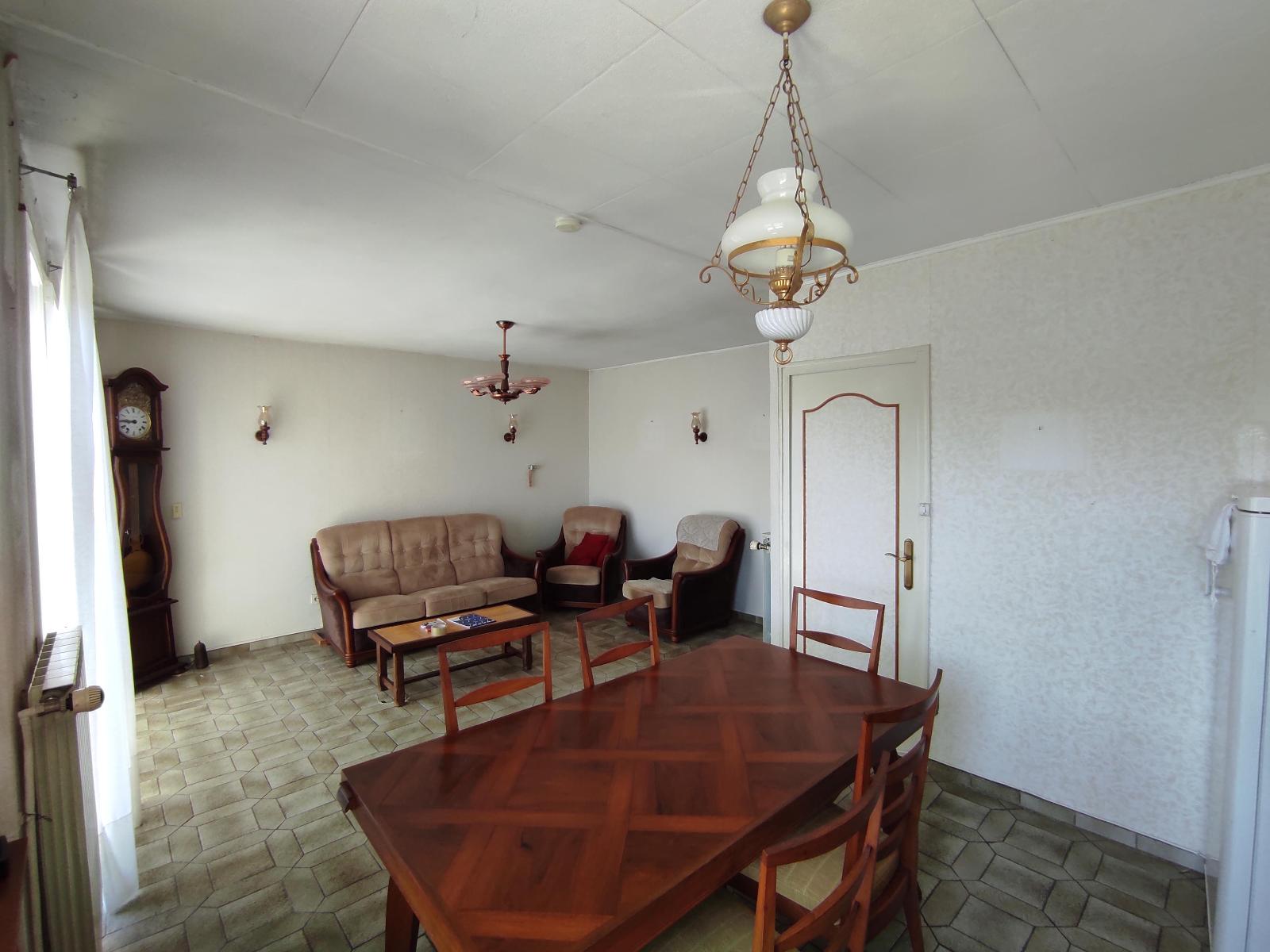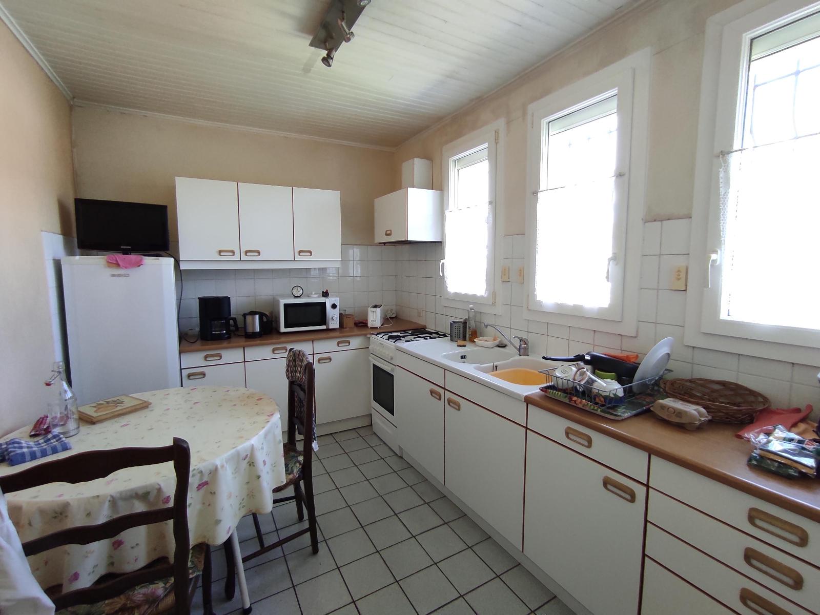 Elle se compose en plain-pied, d’une cave, une cuisine d’été, ainsi qu’un garage attenant. A l’étage, un couloir desservant une cuisine aménagée, un salon-séjour lumineux donnant accès à un balcon, deux chambres, une salle d’eau et un wc indépendant.
